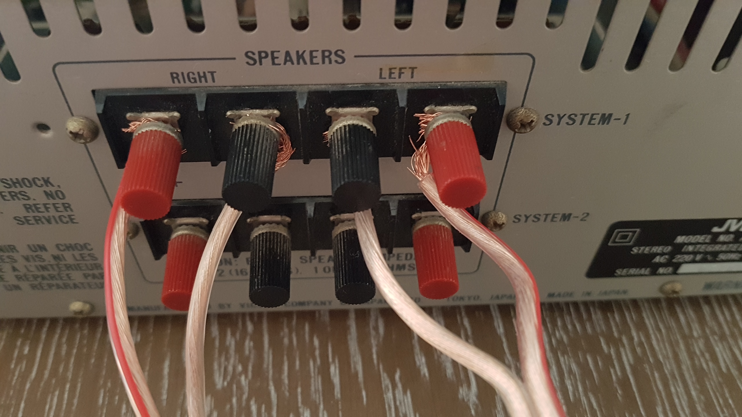 On this amp you have to roll the wires around an axle and secure them by screwing the small knobs.